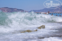 На территории "акрополя" есть 2 небольших бассейна. Оба оборудованы мелким бассейном для детей (+). Для каждого бассейна предусмотрены душевые (+). У одного бассейна есть 2 водные горки (+). Также возможно поставить ворота для водного поло (+), но это небезопасно для других отдыхающих, т.к. отдельной зоны для поло нет (-).