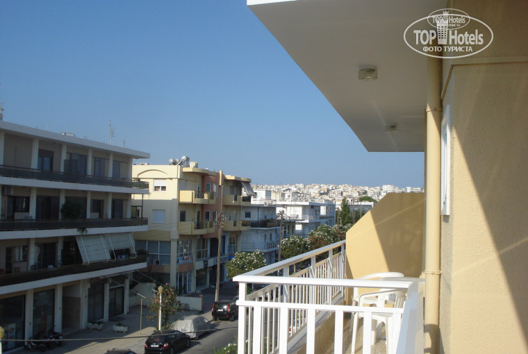 Вполне приличная двушка, ожидала гораздо худшего, а в итоге осталась очень довольна этим отелем. Отдыхали мы вместе с сестрой, номер нам дали на 4 этаже с угловым балконом, вид на улицу, из-за ближайших домов видно море. Т.к. отель расположен в спальном районе города, поблизости практически нет туристических лавочек, и дискотек, на набережной есть несколько неплохих таверен, где всегда можно вкусно поесть.