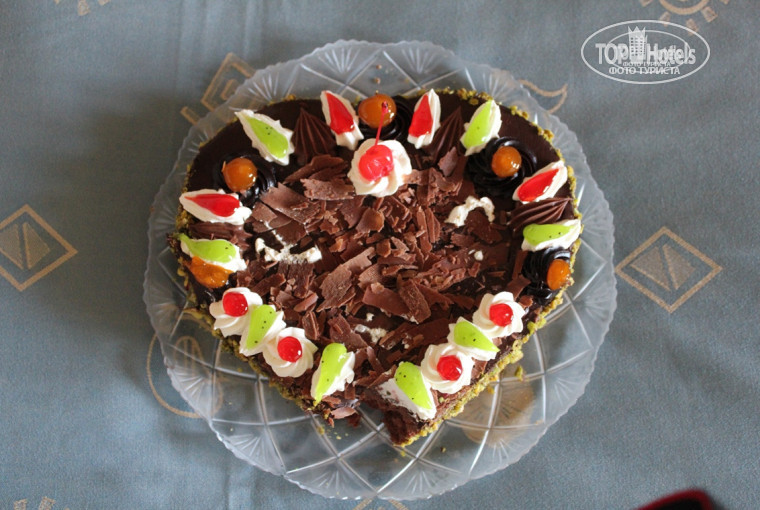 Приехали поздно, в первом часу, развозили нас долго, наверное, минут 40, зато успели послушать "вводные инструкции". На ресепшене заселили быстро, правда, портье был англоязычный, прошли в номер, там нас ждал небольшой приятный сюрприз: поздравительная открытка от принимающей стороны с приглашением на завтраки в "VIP-ресторан", торт в форме сердца и бутылка местного шампанского CAIR, которое считается довольно хорошим. Да, номер воображение не потряс (в Испании 4* больше впечатлили), но в принципе все устроило: вся мебель необходимая есть, даже вторая кровать (односпальная), фен, кондиционер и плотные шторы от солнца тоже в наличии. Куча полотенец, халаты и тапочки были.