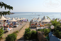 Пробуждение и первая прогулка вселили в нас оптимизм: погода шикарная, территория отеля большая, вся в зелени, пляж, бассейны... Мы специально так строили планы, чтобы поехать в начале сентября, когда народу поменьше и не прогадали - хоть с утра на пляже лежаки занять затруднительно, в целом ощущения плотного заселения не было ни во время завтраков/ужинов, ни снаружи. Места занимали наверху у главного бассейна в тени, купаться ходили на море (проехав полпути по горке, отличная горка, кстати!), или в главном бассейне. Да, вода там хлорируется, но не чувствуется, если не заплывать под мостик. Море обалденное - теплое, ласковое, особенно во второй половине дня, вход с берега, пляж галечно-песочный. Лежаки бесплатные.