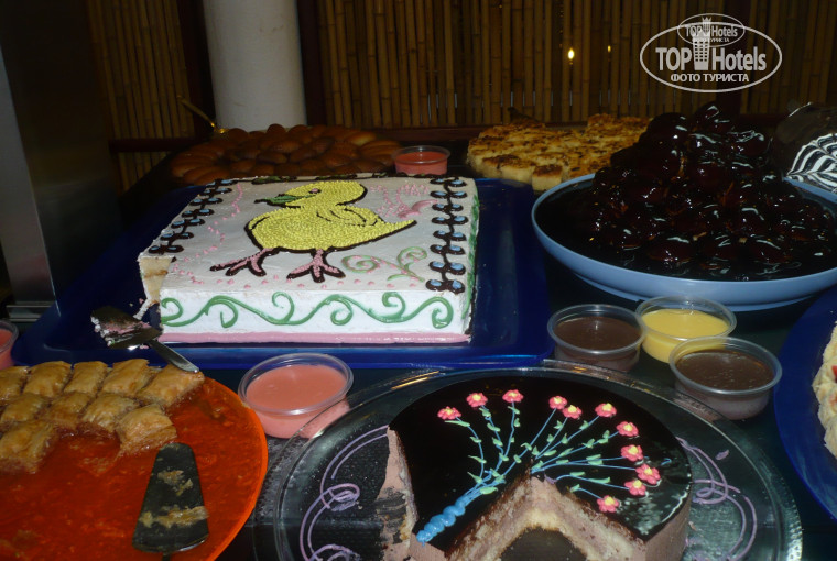 Вообще еда порадовала, конечно, приедается ( мы были 14 дней). Огромный выбор овощей, зелени. Я объедалась баклажанами в различных блюдах. По-моему там и овощами можно наесться. Особенно хочется отметить десерты, это моя слабость, я там оторвалась))) Повара и официанты очень любезные, утром приносили кофе из кофе-хаус, всегда сразу убирали тарелки, обратилась к стоящему в зале повару с вопросом о травке, очень мне понравившейся, он мне с удовольствием ответил, что это портулак. Кстати, меня удивляют отзывы о хамстве персонала. Люди, ведите себя достойно! К нам ВСЕГДА все обращались и обслуживали вежливо, в баре брала сок ребенку, никогда в очереди не стояла, мне наоборот показалось, что к русским там лучшее отношение, учитывая то, что русских там всегда большинство ( в среднем от 60% в мае-июне до 90% в августе), все прекрасно говорят по-русски, к моим детям было столько внимания, что по началу меня это смущало, потом привыкла, то бармен выйдет дочке ручку поцелует, то официант остановится перед коляской, козу построит, имя сына выучили и к нему обращались с приветствиями. Очень приятно! Персонал очень порадовал!!!