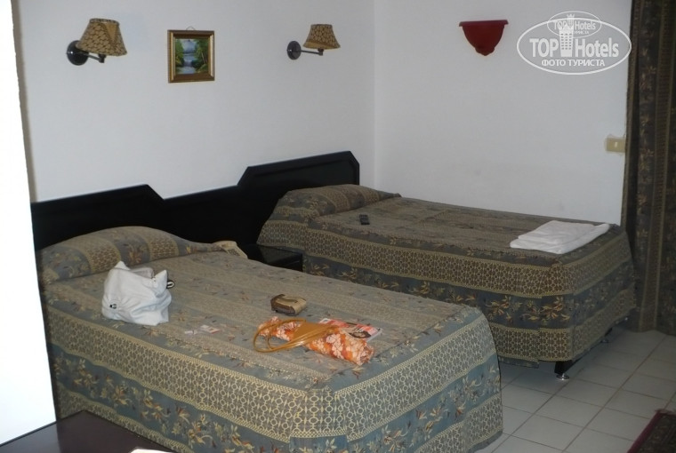 Прилетели мы вечером, нас сразу же разместили в номер, согласились мы на первое же предложение. Номер на первом этаже, вид на бассейн, правда сказали что с двухспальными кроватями нет номеров, так что спали на полуторке:)