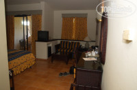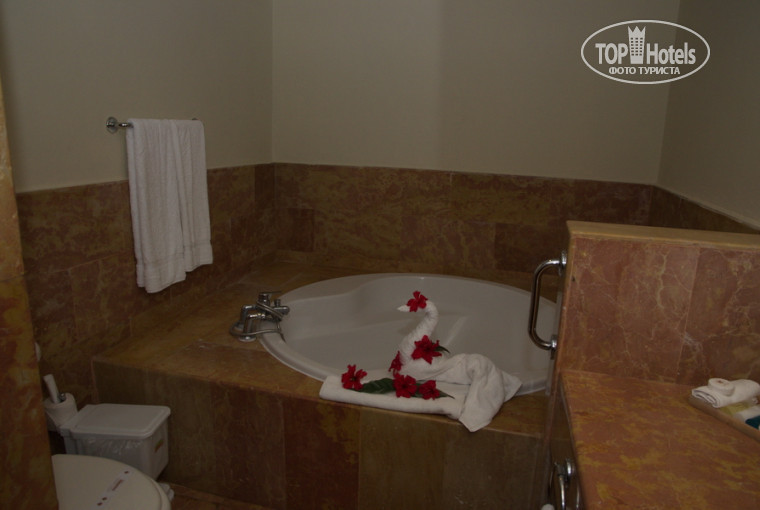 Номер был стандартный, большой, на балконе гамак, в ванной комнате отдельно душ и большая круглая ванная (а-ля джакузи по размерам). Так же в ванной единственная евророзетка с 220в. Горячая вода есть, но течет не всегда сразу, в основном надо было пустить протечь минут 5. На ТВ стоит табличка Wi-Fi Zone. Вранье, сеть ловит, но без доступа к интернету. Интернет бесплатно работает только в районе ресепшн и около главного ресторана. По всей территории стоят Wi-Fi антенны, но это видимо работало когда-то. Да и качество интернета на ресепшене порой оставляет желать лучшего: раз в 10 минут отваливается, но в целом, посмотреть почту и посерфить новости можно. В телевизоре один канал на русском языке (то-ли рен-тв, то-ли ТВЦ, не помню, т.к мне это было малоинтересно). В холодильник каждый день кладут бесплатно 2 бутылки местного пива, бутылки по 0,5: Mirinda, 7-Up, Coca-Cola b Coca-Cola Light. Так же в номере кофемашина к которой полагается каждый день 2 пакета кофе Santo-Domingo. Так же на потолке на люстре вентилятор и есть кондиционер. Мебель... ну если вы приехали за мебелью, то она вам не понравится, если приехали отдыхать на море и получать от отдыха удовольствие, то про мебель можно не вспоминать. Спать удобно, кровать огроменная, софа дополнительная, столик и журнальный и обычный, шкаф для одежды, а что еще нужно?. Нам хватало. Сейф с электронным замком.