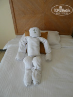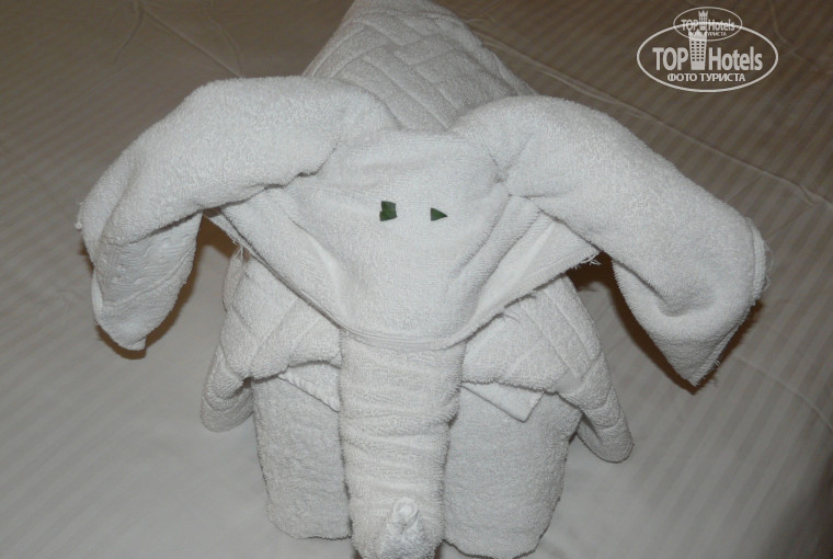 Через полчаса были в отеле, где нам добродушно надели браслеты и отправили на обед, а после выдали конвертик с инфо, карточки от номера и на полотенца. В ТезТур мы оплачивали обычный стандарт, поэтому заселили нас на первой линии, в корпус 4. Номер нас вполне устроил, всё работало, чисто .Убирались хорошо, полотенца меняли каждый день, чайный набор, воду и косметику регулярно обновляли. Оставленный доллар влиял на оригинальность фигурок из полотенец, вместо стандартных лебедей в этот день было что-то прикольное и поднимающее настроение.