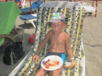 До моря в развалочку идти 5 минут. Пляж - песок+галька, места всегда хватало. В баре на пляже нет пива - ходили к бару у бассейна(не напряжно), зато на пляже в обед были то спагетти с соусом и гамбургерами, то "шаурма" в булках, то тушёные овощи - даже мои дети - привереды в еде - лопали только так! В главном ресторане мы завтракали(яйца, овощи, хлеб, сухие завтраки, через день - яичница, оладья), ужинали(овощи, говядина, курица, макароны, десерт) - голодными не были. Каждую субботу - турецкая ночь(мы попали на две) - приезжают местные торгаши с палатками, но у них дорого. Каждый вечер у бассейного бара местные торгуют попкорном и варёной кукурузой по 1 евро - мои дети каждый вечер у них ошивались. АНИМАЦИЯ КАЖДЫЙ ВЕЧЕР ОДНА И ТА ЖЕ, но дети были в восторге!!! Мы пьём вино, они на анимации - что ещё надо??!