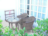 Мы жили на 3 этаже, поэтому у нас была терраса, на ней 2 стульчика и столик, сушка для белья.