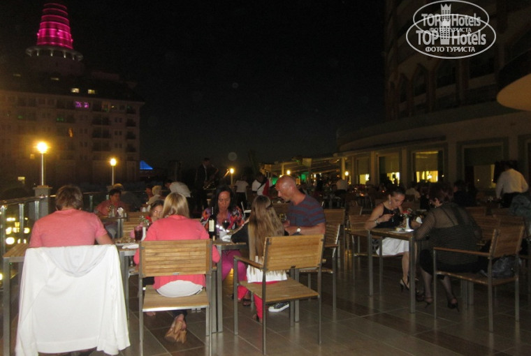 Kuxnya net slov,ochen' vkusnaya eda,ogromnaya terasa gde bylo priyatno pokushat' na chistom vozduxe, a vecherom esli duet veter, terasa zakryvaetsa navesom, ochen' originalno produmanno...I nochyu i dnem vid otelya ochen krasiviy, ne naglyadetsa!!!
