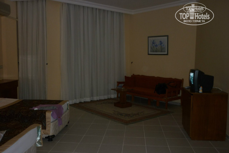 До моря 5-10 мин, пляж супер, лежаки платные, но можно постелить своё полотеце и ни кто ни чего не возьмёт, если есть большое желание загорать, то это на территории отеля возле бассейна, а плавать лучше в море. Поселили меня одну в семейный номер на 4 этаже, с балкона был боковой вид на море и на горы, а прямо перед балконом-пара стройных кипарисов. Номер и мебель без шика, но всё исправно работало и холодильник и кондишен, а что ещё, для того что б переночевать, принять душ и переодеться надо. Главное что б было чисто, а в этом отеле вам это будет гарантировнно.