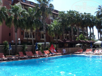 Прочитала отзывы за этот год, всё так и есть. Долго не решалась оставлять свой отзыв или нет. Но всё таки решила, вдруг кому нибудь он будет полезен. В Турцию ездила в первый раз, поэтому сравнивать не с чем. Я думаю для трёх звезд нормально. В мае народу было мало. Для меня это было плюсом. Что бы взять еду не приходилось стоять в очереди, и в бассейне было раздолье, конечно перед отъездом народу по прибавилось.Кормили сносно, для меня и дочери 6 лет хватало. Из мяса была курица, рыба и их котлетки не понятно из чего. Нехватку мяса мы не ощущали. Мужчины налегали на выпечку. Мы наедались различными тушеными овощами. из фруктов действительно только апельсины, один раз давали зелёный арбуз и пару раз местную сливу. Анимации не было почти ни какой, по вечерам пол часа детской дискотеки и час для взрослых. Днём аниматоров не было видно вообще. Но мы от этого не страдали, развлекали себя сами. Говорят, что к концу мая аниматоры зашевелились, может с началом сезона всё будет нормально. Для детей есть не большая детская площадка, где главной достопримечательностью были ручные кролики, дети от них были в восторге. Ещё одним плюсом является маленькая территория, всё на глазах. В номерах нормально(горячая вода, кондиционер, телевизор). Убирались через день. Персонал вежливый. На пляже бар ещё не функционировал. Была только вода и какой то напиток, типа юппи. К стате соков не было вообще. Лежаки с начало были бесплатно, а после 20 мая по доллару. Их почти не кто и не брал. От отеля до пляжа идти не далеко, пляж местами мелькая галька и галька с песком. Пирс был в ужасном состоянии, сломанный и грязный.Если подвести итоги, то к плюсам можно отнести: