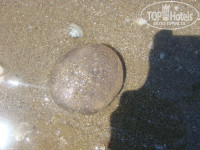 Пляж песочный с хорошим пологим входом в море, у линии прибоя собираются мелкие ракушки, настолько мелкие, что их не замечаешь, копаться только детям в песке надо поосторжнее. День на день не приходился, если море спокойное, то вода прозрачная, если штормило, то прибивало какие-то бурые водоросли и белую пену. Порадовали морские обитатели: много крабиков, маленькие нежгучие медузки, ну и вереницы мальков.