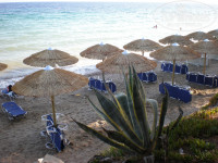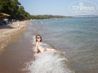 Пляж находиться в 2 минутах ходьбы от отеля. Лучше идти через бассейн, так ближе. Лежали брали только один раз в последний день. В остальное время загорали на полотенцах, подальше от людей. Заход через камни, но если поискать, то можно найти расчищенную кум-то тропинку. Море чистейшее. Днем полный штиль, а осле ужина можно покататься на волнах. Очень теплое. Прошлись по всему берегу влево, до 5* отеля, могу сказать, что заход везде такой, даже у пятизвездника. Лежаки оплачивали на ресепшение 4 евро за два лежака и зонтик - это дешевле, чем на островах, где тот же набор обойдется в 7,5 . можно оплачивать на весь отдых, будет дешевле и у вас будут постоянные лежаки со своим ключом.