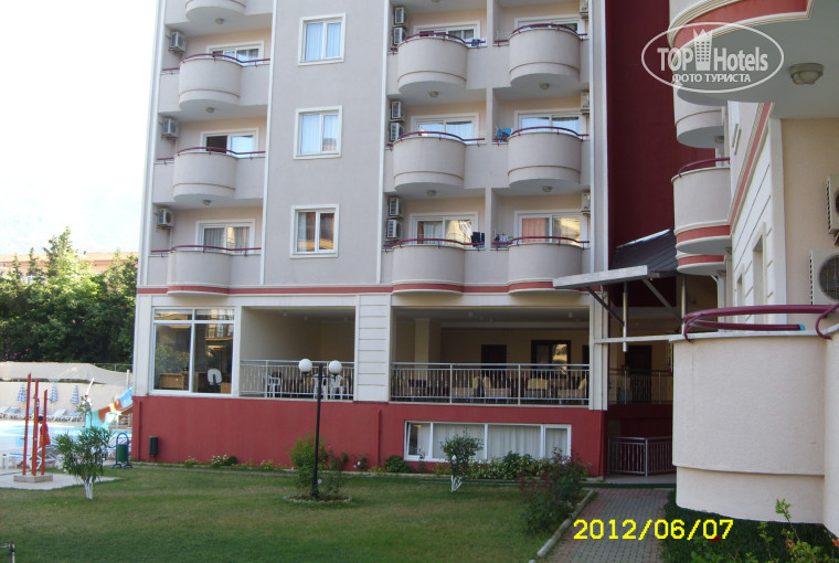 Отдыхали в отеле с 25 мая по 7 июня 2012 года. В Турции первый раз. Разместили нас сразу, номер двух комнатный, а нас было трое, постелей было две, после обращения к администратору сразу все исправили. . Но у знакомых были проблемы с размещением их на сутки заселили в 3* - рядом через дорогу, там клетушка а не комната.
