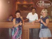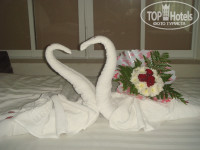 Номер был во втором корпусе, на втором этаже. Вид из номера супер - под нами бассейн, а напротив пальмы-пальмы...Номер очень уютный, убирались и меняли полотенца каждый день, постель раз в три дня. Даже туалетную бумагу не жалели, не то, что в Китае. В мой день рождения два тайца мне в номер принесли букет, пели Хэппи бёс дэй, а после горничная на моей постели скрутила двух белоснежных лебедей из полотенец и усыпала их лепестками роз (после я узнала, что о дне рождения напомнила им подруга, но все равно было ооочень приятно). Чаевые оставили только один раз - 100 бат. Персонал дружелюбный, но все же советую хоть парой фраз по-английски овладеть, чтобы и вам и им было легче понять желаемое. По территории, да вообще по улицам, шныряют приколные ящерки. Вот чего я первые три боялась, так это гигантских тараканов, но потом подружилась с ними. Хочу заметить, что в номерах никакой живности не было. Еще по улицам по вечерам, когда уже темно, возле мусорных мешков бегают чудненькие крысы, как котята, но к ним тоже привыкаешь.=)
