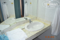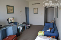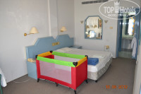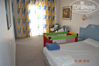 2. Заселение - без проблем, 5 мин. Номер family room, 2х-комнатный, 4 этаж, 423, боковой вид в сторону моря и бассейна, и в то же время не шумно. Достаточно просторный, в гостиной диван, тахта, телек (русских каналов мы так и не нашли), холодильник, чайник (все бесплатно). В спальне огромная кровать и 2 тумбочки, фен. Балкон в каждой комнате. В ванной комнате ванна, а не душевая кабина, раковина и унитаз (подтекал, но проблема решилась подставлением пластикового стаканчика)) ), в "предбаннике" ванной еще одна раковина. Имеется гардеробная со смешными вешалками, сейф (платно). Мебель не новая, кондиционер в спальне только для вида - эффекта ноль. При открывании балкона в гостиной, кондиционер выключается. И еще в номере очень противный запах, правда через 2 минуты привыкаешь.
