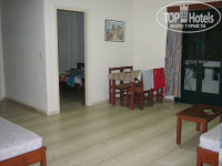 - большая комната с обеденным столом и стульями, двумя диванами, журнальным столиком и телевизором (кажется 2 канала на русском);