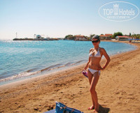 До пляжа мы шли 10-12 мин. Пляж песчаный, достаточно широкий, чистый, места всегда были и на лежаках, и на песке:) Никогда не был полностью забитый пляж, занятые лежаки. Стоимость лежаков, как уже писали, немалая - за комплект 2 лежака+зонт = 8 евро, и без зонта, тоже 8 евро:) 1 лежак-4 евро, соответственно. Любили загорать недалеко от Макдоналдса. Заход в море плавный, нет резкого перехода. В принципе, также как и в Айя-Напе на основном пляже. Идешь - мелко, потом постепенно набирается глубина. Море прозрачное, чистое, теплое. Водорослей никаких не было, мусора тоже не наблюдалось. Видели в море белого крабика, морскую звезду и медузку небольшую. А так живности там не видно. Но, может, если где-то на глубине, но я не ныряла. Волн на море не было, только легкие колебания. Для любителей развлечься на пляже - можно покататься на банане, на воздушном шаре - парапланов я там не видела. И еще есть какая-то очень интересная штука - что-то типа таблетки, только катаются на ней не лежа, а почти в вертикальном положении. На пляже мы довольно редко встречали русских, что радует.