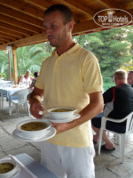 Завтраки - шведский стол: мюсли-хлопья, яйца вареные, йогурт(больше похож на взбитую сметану), персики в сиропе, бисквитный пирог, мед, мармелад, молоко, кофе, чай, сок персиковый. Индивидуально выдается масло сливочное, ломтик сыра, ломтик колбасы ветчинной(очень любимой осами - если им позволить, то они сделают из нее ажурный мясной платочек), булочка, хлеб. Ужин - обслуживание официантами: суп( в разные дни были куриный, овощной, рыбный, грибной, чечевичный), второе блюдо с гарниром(филе рыбы в кляре, гуляш говяжий, котлета рубленая мясная с зеленью, курица тушеная; пару раз были соево-мясные котлеты, но гигантские), салат овощной, десерт(арбуз, дыня, желе). Напитки на ужине не предусмотрены, но кувшин с минералкой - бесплатно(в Турции такого не было). Наедались так, что не хотелось выходить из-за стола. Супруга дома так не питается. В итоге - поправилась на 3 кг.