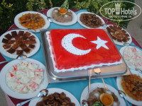 Заселились, шланг принес нам наши чУмоданы, дал ему пару баксов-заслужил. Одели шорты и к бассейну! Еды вагон и маленькая тележка, если что то не понравится, я думаю любой найдет для себя чем набить ему кишку, будь это мясо или рыба, или если ты толстый сладкоежка)) всего очень много!!! С качеством алкоголя конечно хромает... Вискарь бадяжный, вино ослиная моча, пиво местное Эффес тоже так себе, но пить можно и я им накидывался!)) Бармены мутят прикольные коктейли, но вечером когда убирают шезлонги и лежаки, та территории ставят кальяны-но курят, друзья, они вовсе не дурь, а хотелось бы) ... После 23:00 бар там платный и те же самые коктейли, которые дают на халяву днем, за деньги они ГОРАЗДО вкуснее и на мой взгляд качественнее!!! Кто отдыхает одними девочками или мальчиками-найдете себе компанию однозначно! 750 номеров!!!!! Там одиноких очень много-так что если даже захотите пошпилиться-все будет!)))