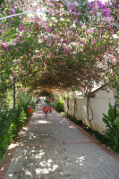 К морю от отеля ведет дорожка вдоль соседнего отеля, оформленная аркой из цветущих деревьев, около пляжа - бар.
