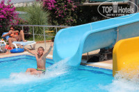 Территория не большая, но очень уютная, опять таки нам в коттеджах было намного лучше, чем в основных корпусах - практически вся зелень была около нас. Горки две, можно сказать детские, но работают всего 2 часа в день. Вокруг отеля - поле, так что сходить некуда. Море грязное, пляж не красивый и тоже грязноватый.