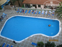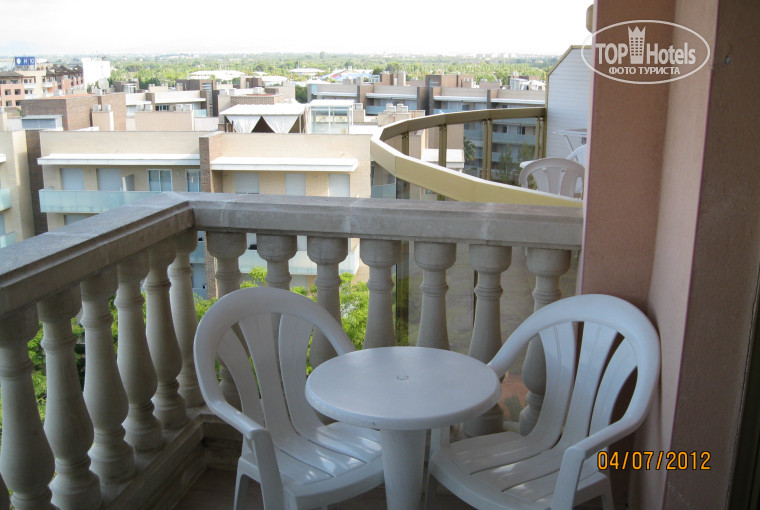 Номер попался очень удачный. Балкон выходил на второй бассейн. 4-ый этаж. Балкон угловой, т.е. слева пластиковая перегородка, а справа следующий полукруговой балкон, поэтому вид был на 2-е стороны - горы было видно.