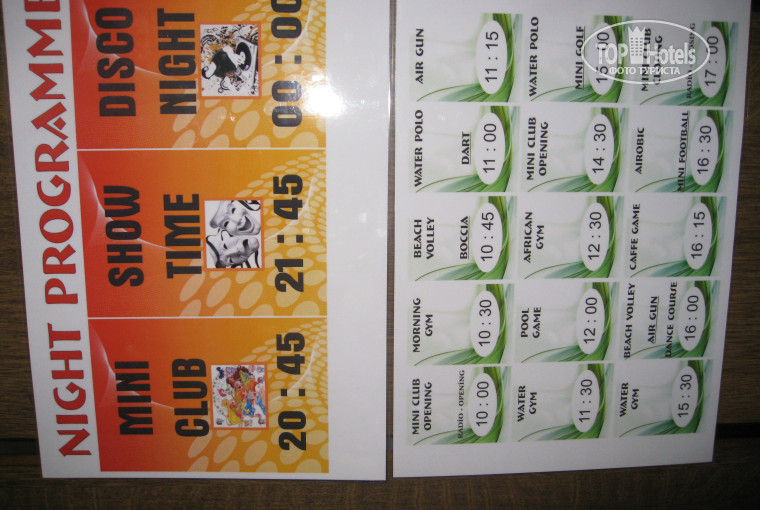 Развлечения на 3+: вечером детская дискотека, представление и все. Спросила у нашего гида, какие днем развлечения. Мне сказали, что аниматоры ходят по территории и приглашают, я их видела только 2 раза, приглашали на волейбол и на акваэробику в бассейне. И все!!!! И только потом в конце нашего отдыха вывесили расписание развлечений (смотрите фото). В отеле, есть хамам, делают массаж – мы не ходили, но люди говорят, что очень здорово. На пляже брали байдарку, водный велосипед был сломан, платно брали скутер (45$ за 10 минут). Есть фотографы, которые предлагают фотосессию или просто одну фотку сделать, например с попугаем. Цены отличаются напорядок, советую торговаться.