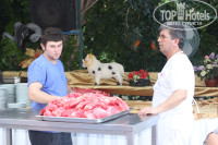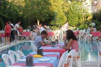 Питание очень скромное. На завтрак всегда очень жидкая рисовая каша, что-то типа йогурта, не всегда вареное яйцо. И все. Выпечки никакой. На обед добавлялся супчик, противные соевые переперченные котлетки и гарнир макароны или картошка. На ужин разнообразия побольше: мясо появлялось, гарниров больше, салаты. Выпечки опять же нет. Один вид. Из фруктов арбузы (полусладкие), такая же дыня, под конец отдыха появились апельсины и сливы. Забыла, один раз были абрикосы, которые давали по 4 штучки в руки. Официанты в костюмах только на ужин приходили, в остальное время в задрипанных футболках и шортах. Эта их идиотская система резервирования столов на ужин, своим туркам лучшие места выбирают в тени деревьев, а остальных выгоняют.