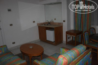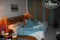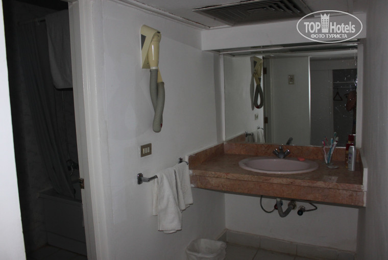 Про номера... Жили мы в бунгало, как я уже говорила, но и они естественно тоже НЕ ФОНТАН!!!(просто по сравнению с номерами в основном корпусе - это хоть как то можно назвать жилым помещением!) Мебель старая, потрескавшаяся, кресла уже довольно затертые. Когда мы въехали в бунгало, у нас была оборвана занавеска(но на это мы уже просто закрыли глаза). Так вот, нам ее на место так и не повесили, весь наш отпуск она провисела оборванной с одного края. Кстати, о фене!!! Хорошо, что я догадалась взять свой собственный фен, потому что тот, который висит в ванной... ну я так и не поняла, что это такое... дует он холодным воздухом(соответственно фиг высушишься им), да и напоминает по внешнему виду он больше какой то космический прибор, чем фен... Постельное белье было все в катышках, одеяло без пододеяльника(типа простынка, и сверху одеяло). Зато мы порадовались телеку с тремя русскими каналами!!! Уборщицы приходили, убирались, но НИКАКИХ вам там полотенец никто ни за какие чаевые не накрутит(я имею ввиду фигурки из полотенец)... мелочь конечно, но все равно хотелось. Пробовали оставлять чаевые-нифига не сделали.