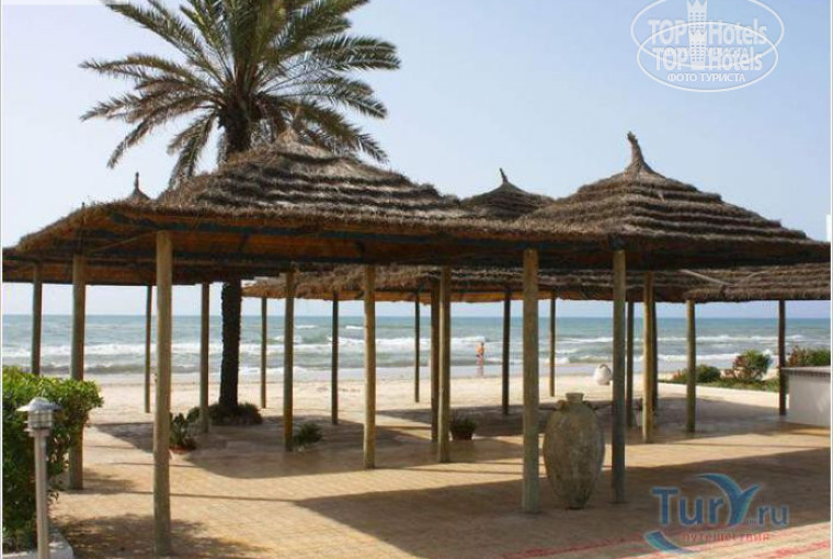 Лежаки и матрацы у бассейна бесплатные, а на пляже стоят по 2 динара. Пляж песчаный, но у самой воды полоса гальки, шириной метра 2. Лучше иметь специальную обувь, иначе заходить, а особенно выходить из воды очень неудобно. Пляж не очень чистый, но в последний день видели как его чистили несколько тунисцев.