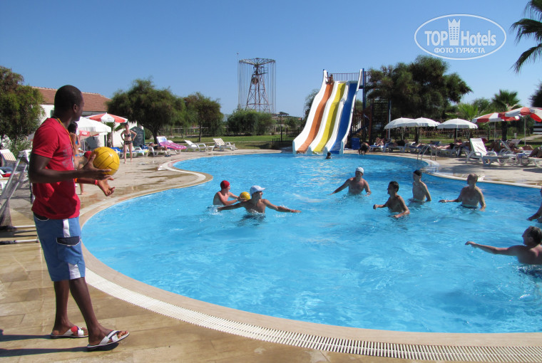 Как только приехали в отель, нас хотели поселить в эконом-класс. Но 20$ все решили и нас заселили сразу! в стандартный номер. Я конечно, от номера, ожидала большего. Когда мы вошли в номер, все стало печально. Двери очень старые, покрашенные краской, унитаз весь ржавый, душевой кабинки не было (хотя это уже давно не роскошь и могли бы поставить), т.е. когда купаешься стоишь ногами просто на холодном кафеле. Воды горячей тоже не было!! Пол из ламината, кровать.... ну это скорее были просто два матраса без спинки, соединенные вместе. Мебель стояла нормальная, был телевизор с 2-мя российскими каналами. Никакого мини-бара в номерах не было. Не понимаю зачем они это пишут. Был холодильник который не работал! Телефон тоже не работал! Я не ожидала, что будут такие условия.... но побыв на море с водой +29 градусов, я немного успокоилась. И смерилась с тем, что есть. Территория большая, по сравнению даже с рядом стоящими 5* отелями. Очень много зелени, что приятно радует глаз!)) Питание было на любителя. Мой муж ел все подряд))) я такую еду ела с трудом. Еды всегда было много и много фруктов. К еде претензий нет, просто мне она не подошла. Обслуживание было замечательным!!! Может кому-то не понравилось, но меня всегда обслуживали и относились ко мне прекрасно на протяжении всего моего отдыха... может потому что я была мисс отель! )) Анимация, как для меня, была тоже отличной!!! Развлечения и конкурсы были каждый вечер! Днем мы играли в дартс, настольный теннис и Water Ball. Отличный был аниматор Emre и Regi. Анимации на английском и турецком языках, но там есть отличный переводчик Рустам. Впечатления остались самые лучшие особенно от моря, от инфраструктуры, от отношения персонала и от развлечений!!!