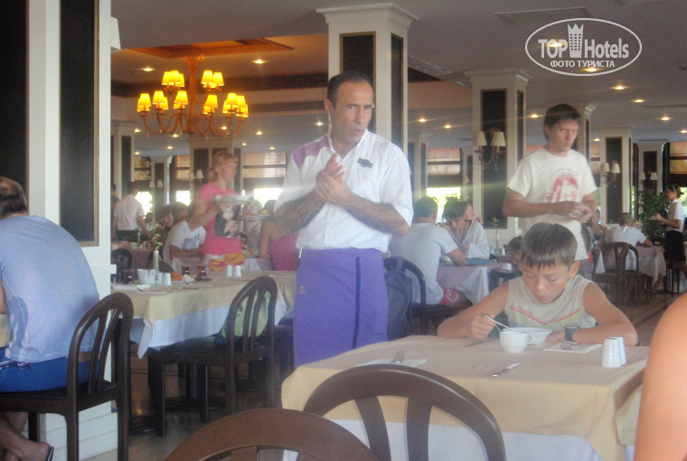 питание хорошее,иногда становилось жалко продукцию, ну не съесть такое количесво сладкого. Порадовало название мясного блюда котлеты на гриле.(оказалось шашлык из баранины) Обслуживание офицантов хорошее .Но один официант (фото приложено)обслуживающий правую сторону ресторана после детского стола наверное без чаевых рукой не двинет. За 3 дня завтраков и обедов ни разу не подошел к нашему столу ни для уборки посуды для заказа напитков.