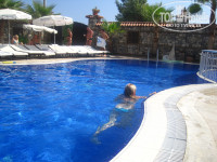 Отдыхала с мамой в сентябре 2012 года,. Ну что сказать....В целом мне все понравилось. Я в Турции первый раз, и перед отъездом мне много чего наговорили, но половина из этого была неправдой. Ну, во-первых, хочу сказать турагенству, что врать - нехорошо!! Просили пляж мелкую гальку с песком. Там же на берегу крупная галька а в море оргомные камни. Покупать тапочки извините, как-то хочется чтобы и ноги были свободно в воде. Я ходила очень аккуратно, и порезала ногу только один раз. Но море было чистое. Что касается самого отеля: мы приехали в 12 ночи, нас сразу же заселили. Не работал кондиционер, но на утро это исправили. Обед и ужин - это самый настоящий кошмар! Там отдыхали одни россияне, (мы из Беларуси) это нужно было на камеру снимать как они летели, толкались, еще и ругались за эту еду. Я постоянно сидела за столиком и выжидала где-то полчаса, когда же этот ажиотаж закончится. Понабирают тарелок, а в итоге все не съедают. Некрасиво. Еды хватало всем! Персонал хороший, приветливый, мальчики красивые, и что самое главное, я отдыхала только в отеле! За его пределами, все эти продавцы, когда идешь мимо, бесконечно липнут и пытаются познакомится. При чем я еще и блондинка. Может из-за этого. Не знаю, в общем. Но меня это порядком напрягало. Повара молодцы! И кажется хозяева сами тоже следили за обстановкой в отеле. В номере была уборка каждый день, да, горячая вода у них только в обед и вечером. Утром и ночью ее нет. Ну и ладно. Пляж через дорогу, по утрам лежаков хватало не всем. Ну ниче! Я и на покрывале посидела. В общем, мне поравилось, не считая выше перечисленных мелочей, дальше смотрите фото))
