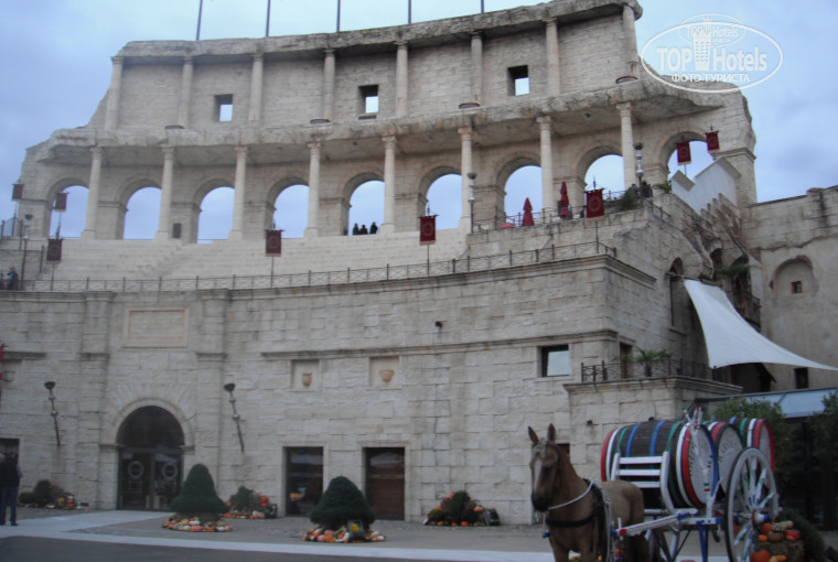 Сразу скажу, что отель нам очень понравился. Решили поехать с ребенком в Европа-Парк, и заодно, посмотреть Баден-Баден и Страссбург. Все находится неподалеку. Представитель турбюро предложила остановиться в этом отеле, о чем ни разу не пожалели. Отель расположен рядом с парком и для проживающих имеет отдельный вход прямо в парк. Рядом с отелем 2-х этажная бесплатная парковка. Сам отель выполнен в стиле античного Рима. Все продумано до мелочей, даже одежда персонала на рецепшн, в ресторане, уборщиц. Все комнаты и стандартные также обставлены и выполнены в итальянском стиле. Рисунки на стенах, фрески, мебель, а детская двухэтажная кровать, которая запряжена двойкой лошадей! Убирались очень чисто. Наши окна выходили во дворик, типа итальянского, посредине фонтаны, которые к вечеру играют разнообразием красок и танцуют под музыку. Конечно, это не барселонский фонтан, но тоже здорово. Тут же фрагмент стены Колизея. Говорят, что летом во дворе устраивают шоу, мы ни одного не видели, наверное, не сезон. Но зато весь отель был уже оформлен к празднику Хэллоувин. Дети были в восторге. На первом этаже для деток есть развлекаловки: лазалки и детские компьютеры. Есть и игровые автоматы для детей постарше.