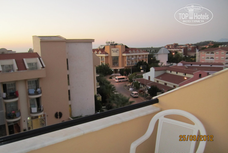 Отдыхали в этом отеле с 22.09.12 по 05 .10.12, погода в это время была супер, днем 30-33 , вечерами попрохладнее 25. Нам отель понравился: чисто, красиво, везде светлые тона, номер то же светлый, маленький но уютный, у нас был обычный стандарт: большая кровать, тубочка, комод, шкаф, холодильник, кондиционер в нормальном состоянии, фен больше ничего и не нужно, во всех номерах есть балконы со стульчиками, мы жили на 4 этаже, если балкон закрыт то абсолютно не слышно шума.