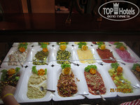 - на завтрак вседа колбаса, сыры - обычный, соленый, с травами, свежие овощи, салаты, мягкий хлеб, яйца, бывает яишница с помидорами, повар может пожарить большие оладушки, типа блинчиков, щербет.