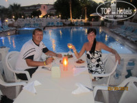 Разместили нас сразу по приезду, Адэм на ресепшене очень хороший человек, легко разговаривает по русски, поможет в любом вопросе, все объяснит без корысти и всегда с улыбкой. Весь персонал одна большая дружная компания. Официант Исмагил очень веселый, всегда что-то напевает, а какая скорость и ловкость работы, столы всегда чистые, скатерти меняют каждый день, всегда приятно завтракать, обедать, а на ужин мальчики-официанты создают приятную вечернюю атмосмеру, зажигают свечи на каждом столе, все пытаютя нарядится, т.е выходят не в пляжном виде, работники вседа желают приятного аппетита, в течение дня ни раз спросят как дела. За баром работает Мехмет то же очень хороший, наливает любые напитки и в любом количестве, но до 11 часов. Пиво нам понравилось, вино то же не плохое, только сухое, на любителя. Мужчинам нравилась их водка раки, можно заказывать джин с колой, фантой, лемоном. Возле бассейна, как и на пляже есть чистая питьевая вода, сухие соки разведеные. В баре можно поиграть в бильярд 2 $, шахматы, шашки, нарды бесплатно. Бассейн досточно глубокий 1,55 для моего роста, чистый, вокруг много лежаков. Большое удивление вызывают пляжи, практически нет мусора при таком потоке туристов. На каждой морской экскурсии завозят в разные бухты, кажется что вода разного цвета. На пляже можно поиграть в волейбол, покататься на банане, яхте, каное.