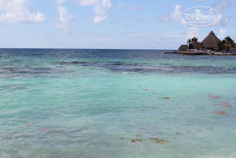 Пляж очень необычный и разный. Слева находится лагуна. Она отделяет наш отель от отеля Aventura Cove Palace. В лагуне всегда очень теплая вода, там относительно мелко, но особого пространства для плавания нет. Дальше к морю идет гряда черных камней, до нее можно добраться по небольшому в некоторых местах обвалившемуся импровизированному мостику из обломков. Там ничего особо интересного нет, просто красиво разбиваются волны. Далее идет пляж Catalonia Riviera Maya. Он состоит из небольшой территории белого песка с лежаками и пирса. Здесь наиболее хороший вход в море, мало камней и в основном песочек. И рядом лежаки вдоль пирса. По пирсу можно прогуляться и понаблюдать море во всей красе и панораме. Сразу после пирса начинается пляж Юкатана. Так уж довелось, что мы были все время на нем, раз уж нас поселили в Юкатане. Вход в море очень плохой, сплошные камни. Очень трудно войти и выйти. И когда волнами прибивало водоросли, то все они кучковались как раз на этом пляже. Зато много лежаков, вокруг белый-белый песок, такой белый, что аж фотоаппарат не фокусирует, прямо на пляже бар, и волейбол. Дальше нужно совсем чуть-чуть пройти, преодолеть островок пальм, и вы окажетесь в отеле Dreams. У них самый лучший пляж. Правда, пространство совсем небольшое. Зато только песок и чистое-чистое теплое-теплое море.
