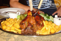 Сам готовит, за всем следит. Его фирменные блюда — мы брали вепрево колено и утку — просто не передать. Колено — на двоих-троих с гарниром. Само блюдо — по нашему рулька называется, нежирное, практически одно мяско, сверху золотистая, прозрачная румяная корочка — думается она даже вкуснее самого мяса. Очень советую в общем.