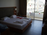 Заселили достаточно быстро. Приятной новостью было-то что под наш приезд (человек 15) оставили покушать. Не приятной-то что за номер с видом на бассейн и соответственно на море нужно доплачивать +10% от стоимости. Варианты с администратором типа – « а может как-то решим» не прошли. Только на ресепшен за полную стоимость. Свободных номеров полно, но переселить отказали. Присмотрелись… Номера все абсолютно одинаковые, вид с третьего этажа где достался нам номер хоть и на улицу, но тоже ничего. Согласились на этот. Обращаю ваше внимание - вид на море должен указываться в документах. Уточняйте это обязательно у своих туроператоров. Замки у номеров - электромагнитные карты. Достаточно удобные, приложил, открыл дверь, всунул в прибор на стене- электрика в доме работает, высунул-ничего не работает. ( поясню, для тех кто столкнется впервые). Пару раз эти самые карты размагничивались и отказывались открыть дверь. В этом нет ничего страшного, ресепшен к таким моментам привык. Смело меняйте карты у администрации. Вот на балконный замок нужно обратить особое внимание. Там раздвижная пластиковая дверь у которой обычная защелка, но закрыть эту дверь можно из номера и с балкона, а открыть только из номера. Догадайтесь почему я об этом так подробно пишу. Ясное дело – закрылся с женой сразу как приехал. Не хотели запускать прохладный воздух с улицы. В принципе и закрывать его не хотели, так прикрыть. Но колесики на которых ездит та дверь оч. чувствительны и она легко защелкнулась. Только потом понял что без поломки ту дверь с балкона не открыть. Ситуация комическая, на улице ночь, внизу ни души, да и если кто-бы был, языка точно не знает. Стоим мерзнем на балкончике. Выручили соседи земляки, которые слава богу, услышали наши крики. Потом оказалось что эта молодая пара побывала в такой-же не совсем комфортной истории. Администрация отеля скорее всего знает про те защелочки, но ничего не делает, да наверное ничего и не сделает. Просто обратите внимание. Зная ничего страшного. Номер просторный под 18 квадратов комната квадратной формы. СУ совмещенный, есть фен, привычной шторки в душ нет. Почему нет? -так нада (ответ администрации). Но от этого не дискомфортно. Кстати не во всех номерах душ, бывают с ванной, это можно уточнить при заселении. Фен на 3 день сломался. Электрик пришел на 4й. Исправить его не смог, как и толком снять со стены. Пришлось ему помочь. Кстати зря, т. к. фена до конца отдыха мы так и не увидели не смотря на напоминания. Немного смутило отсутствие привычного нам постельного покрывала. Все кровати в этом отеле стоят под белыми простынями и все. Ничего - привыкли. На стене LCD телевизор порадовал двумя русскими каналами. Кровати с довольно качественными матрасами. У окна приятного окраса занавески из плотной ткани, 4ре настенных светильника, есть свет и на балконе. На балконе так-же стол с 2мя пластиковыми стульями. Пол-кафель. Небольшого размера холодильник , шкаф для вещей и сейфом (ключи от сейфа только под залог), зеркало, пару прикроватных тумбочек, стол, пару стульев. Пожалуй все. С количеством полотенец в ванной все в порядке. Желаете их сменить, просто бросьте на пол, уборщица их заменит. Есть нюанс с полотенцем для пляжа. (оно в отличии от тех что в номере зеленого цвета) Его дадут только под залог 15 долларов. Дабы не провоцировать на кражу. ))) Шампунь и м