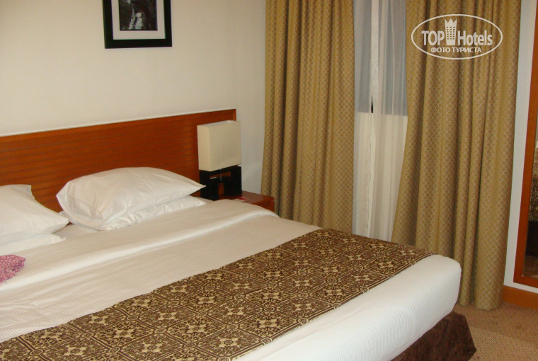 Случайно поехала, совпало несколько факторов, про ОАЭ и не думала предложили в агентстве... Номер был большой, двухкомнатный, два санузла. Уборка каждый день, в номере: литр воды, чай, кофе, сливки, сахар, обновляется каждый день. Из техники телевизор, холодильник, утюг, фен, доска гладильная, переходник, сейф. У некоторых была кухня в номере. Единственный минус окна выходили на зад супермаркета, но я шторы-то открывала раза два-мне было все равно. Куча полотенец, огромадная кровать, телевизор тоже приличный, два русских канала.