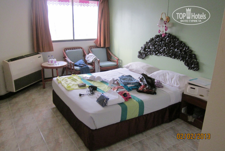 Приехали мы в отель часа в 16. Сразу на ресепшене отдали тайке 40 бат, на ломаном английском-русском пыталис объяснить,что нам нужен хороший номер. Она долго смеялась, но потом все же нашла для нас местечко) Летали с подругой вдвоем. Начитавшись отзывов об отеле, ожидали худшего. Разместили нас на 5 этаже в 523 номере. Номер чистый, только что покрашен после ремонта. Хороший холодильник (он же бар), старенький телевизор(который мы проверили в первый день и больше ни разу не включали), чистое постельное белье и два белоснежных полотенца. Все как и должно быть в 3*. Никакой плесени, тараканов, пауков, муравьев и прочей мерзости небыло и в помине. Персонал очень улыбчивый, лружелюбный. Оставляли несколько раз по 20 бат на чай уборщице. Особой разницы в уборке за деньги и бесплатно мы не заметили. Убирались ежедневно, оставляли по 2 бутылочки с водой, шампунь, гель для душа и мыло со специфическим тайским ароматом). Завтраки однообразные, но достаточно сытные. Но обед ходили в Централ-Фестиваль (находится на соседней улице в сторону пляжа). Рядом с отлем ночной рынок, до городского пляжа минут 15 пешком.