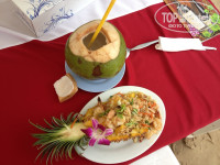 О завтраках всё написано, нам было достаточно - всё вкусное, свежее, блинчики с мёдом ребенок до сих пор требует на завтрак, еще его кормили хлопьями с молоком, сами брали очень вкусный йогурт, омлеты, иногда что-нибудь из тайской кухни и, конечно, фрукты. Обедали чаще всего в кафе на пляже Савой, там в 12 часов еще тень от деревьев, поэтому не жарко. Просто под зонтиками уже тяжеловато, они нагреваются и даже тень в особо жаркие дни не спасает. Можно всё также заказать на вынос. Ужинали либо в Коби бар (пина колада в кокосе у них лучшая, вкусные рыба и крабы на гриле, но просите не острый соус из майонеза и кетчупа или соевый), либо в Мама-Миа ( у них самый вкусный рис в ананасе с креветками). Везде есть меню на русском с картинками. В рыночные дни (вт., четв., суб.после обеда) никуда не ходили. Я покупала на рынке вкуснейшую рыбу на гриле (80 бат) и суши ( по 6 бат), ну и фрукты. Рыбу даже ребенок уплетал на ура! Еще ему брала там маленькие блинчики с какой-то восточной сладостью внутри (20 бат упаковка)и кукурузу- нежнейшую (20 бат). До рынка и обратно ходила пешочком, дорога минут 10-15, трансфером не пользовалась, т.к. ходила пораньше, часа в 3. Там же можно прикупить для пляжных целей туники, футболки, детские одёжки по смешным ценам.