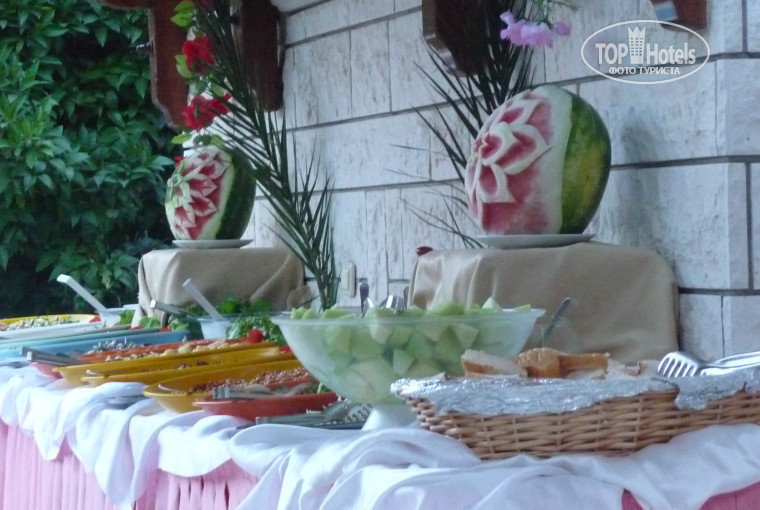 отель действительно не слишком шикарный, но вполне уютный. из персонала там не так много народу чтобы хамить кому либо. мы сталкивались только с добродушным отношением. хозяин всегда с улыбкой встречает. в отеле старается поддерживать тишину чтоб не мешали другим отдыхающим. место тихое, хотя и в центре. до моря минут 15-20, можно ездить на маршрутке бесплатной, но мы предпочитали ходить пешком. ежедневная уборка. если что то попросите в номере сделать-выполнят без комментариев и с улыбкой. завтрак не богатый, но наесться вполне достаточно. сомневаюсь что с утра кто то дома котлеты или кур жареных ест. делают себе такой же завтрак. ужин был на убой. несколько видов салатов, фрукты, горячее нескольких видов.хозяин сам накладывал, но не из экономиии точно. это больше обслуживание для удобства. подходили за 2 порцией накладывал без проблем, довольный что понравилось. спрашивал что хотите завтра-заказывайте-приготовим. еда всегда была свежая!!!!! поваром вообще все были довольны.большая часть отдыхающих -иностранцы. рядом много магазинчиков. с водой проблем не наблюдалось. разговаривали с хозяином-отель имеет свой контингент. русские появились в нем недавно. дорожат своей репутацией, не хотят терять марку. номера просторные. балкон большой.