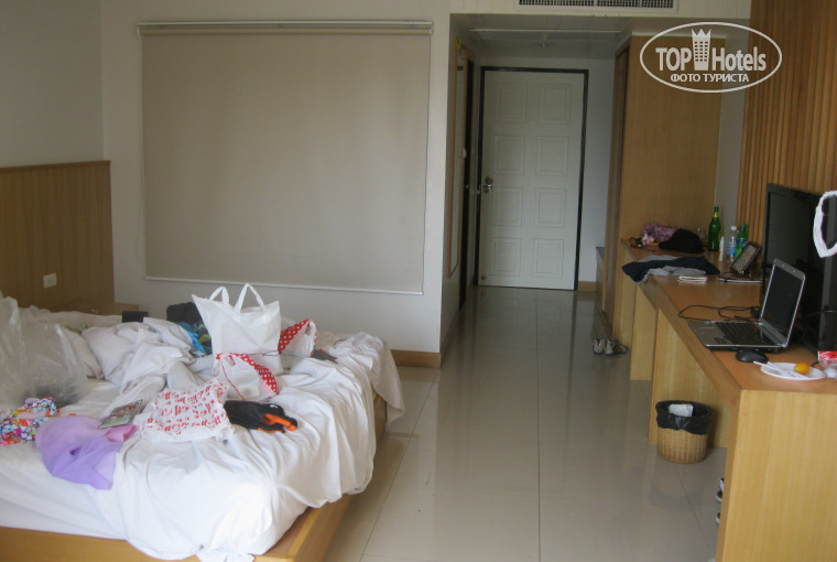 Приехали в отель уже после 12 часов, и нам сразу дали ключи от номера на 11 этаже....начитавшись отзывов знала какие там номера и попросила сразу номер на 4 этаже правое крыло (видела по фотографиям что там был ремонт и выглядит все покрасивее), сказали что будет только через 2 дня и показали нам еще пару номеров с одной большой кроватью, но ванна такая же мрачная и со старой занавесочкой за 200 бат в сутки, мы отказались и решили подождать 2 дня. Без проблем нас пересилили в номер на 4 этаже правое крыло (в левом крыле такие же комнаты как и везде), вот там номер современнее, одна двухспальная кровать и душ. Вот только балкон малюсенький и вид на крышу....но это дня нас не было важным мы на него и не выходили. Кондиционер работал хорошо.
