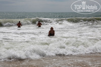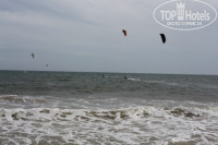 На море довольно сильные волны. Дойти до глубины, чтобы поплавать, довольно затруднительно. Некоторым это так и не удалось. Но зато если дошел до глубины, очень приятно покачаться на волнах. Зато любителям покататься с кайтом полное раздолье. Кайт это воздушный змей, который таскает тебя на доске по воде. После обеда, когда волнение и ветер усиливались, появлялось много кайтингистов. Некоторые уплывали довольно таки далеко в море.