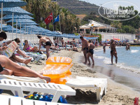 Пляж очень узкий. Буквально 2 лежака в ширину помещается и все. Места занимать нужно рано-рано утром, после завтрака уже свободных нет. Лежаки и зонты - все бесплатно.