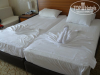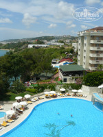 Кстати, огромным плюсом отеля считаем то, что из-за его формы и расположения на полуострове подавляющее большинство номеров имеет так или иначе вид на море - либо со стороны алары 4*, либо со стороны аска бусе 4*. "окон в стену", как нам показалось - не существует. и все, что может помешать обзору - если вас поселят на нижних этажах - это пальмы, амфитеатр и т.д.