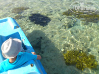 Пляж для семьи с маленькими детьми самое то. Глубина воды в море увеличивается постепенно и не страшно за детей. Лежаков правда не хватало, но, думаю, это из-за того, что предприимчивые туристы заранее вешали на лежаки свои полотенца, а сами пропадали на несколько часов, когда в это время этим местом могли воспользоваться другие: все равно никто по полдня уж на пляже торчать не будет. Но такую картину наблюдали постоянно. В море недалеко от берега (метров 80) есть островок. Возле него можно полюбоваться кораллами и красивыми рыбками. Можно туда доплыть, а можно обойти с правой стороны лагуну за рыбным рестораном и дойти по мелководью, но в обуви (по камешкам больно). На территории отеля есть магазинчики, но дешевле конечно покупать на экскурсиях.