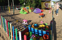 * Детская площадка на пляже в песке. Над ней навес, поэтому все в тени. Огромная куча игрушек. Ребенок играет - родители загорают и купаются.