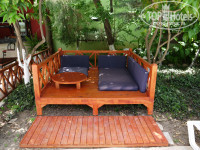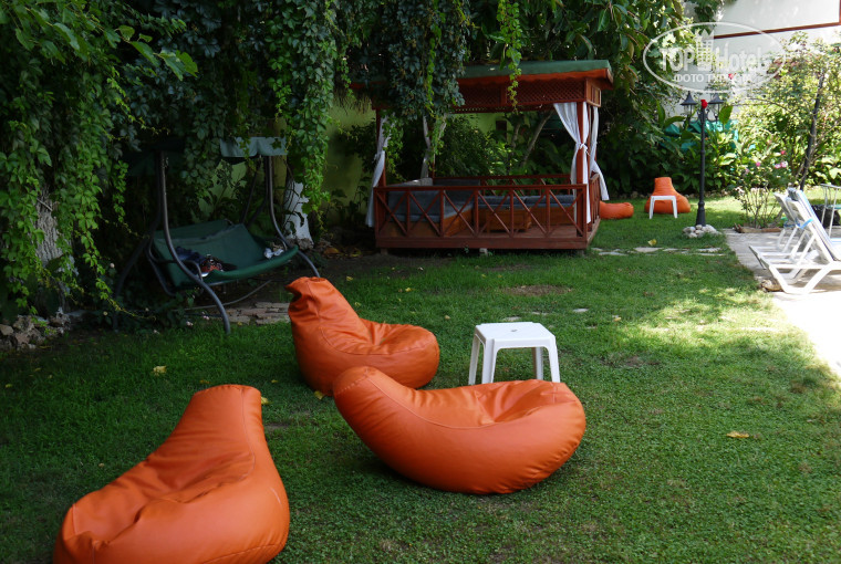 - Территория отеля (внутренний дворик скрыт от посторонних взглядов, утопает в зелени и цветах, растут апельсины, живет семья черепах и рыжий кот, отличный бассейн с чистейшей водой, есть большие беседки с мягкими диванами, везде очень чисто)